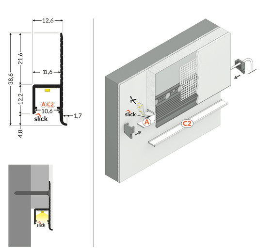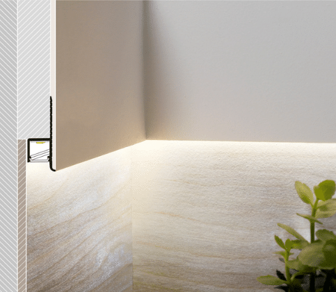 Mooi verfijnd stuc profiel om bijv. een verlicht plintje te creëren.